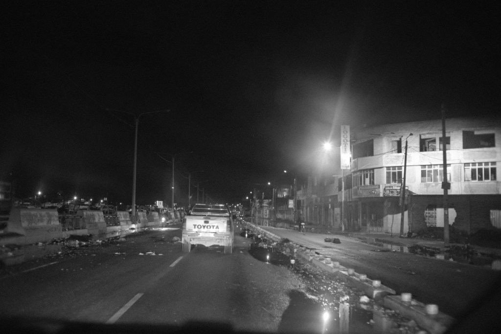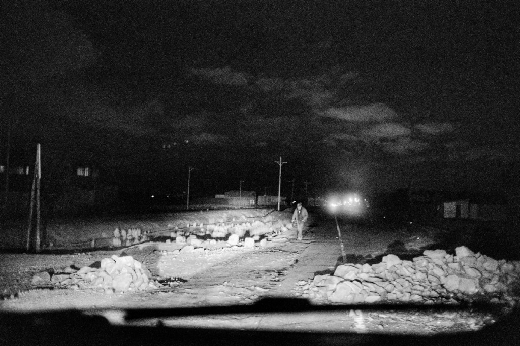 Around 7pm, the barricade opens and we can finally move forward. It is followed by many other deserted road blocks. We reach Juliaca in the night and it looks like a war zone, with rocks all over the road. It’s quite dangerous as we‘re blinded by the lights of the cars coming towards us and we see the rocks at the last minute.