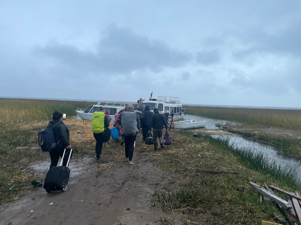 At 4am sharp they come to pick us up. There are more people in the shuttle this time, and we drive a bit further to a smaller port 20 minutes away from Puno. There we’re parked in a building while we wait for our boat. A couple more shuttles bring some more passengers. About 40 in all. The French couple and us are the only tourists. After a half hour our boat is here and we can board, under the rain and the rising sun. It’s not really a harbour, there’s no deck and we must climb into the boat with our heavy backpacks. But we’re really leaving this time!