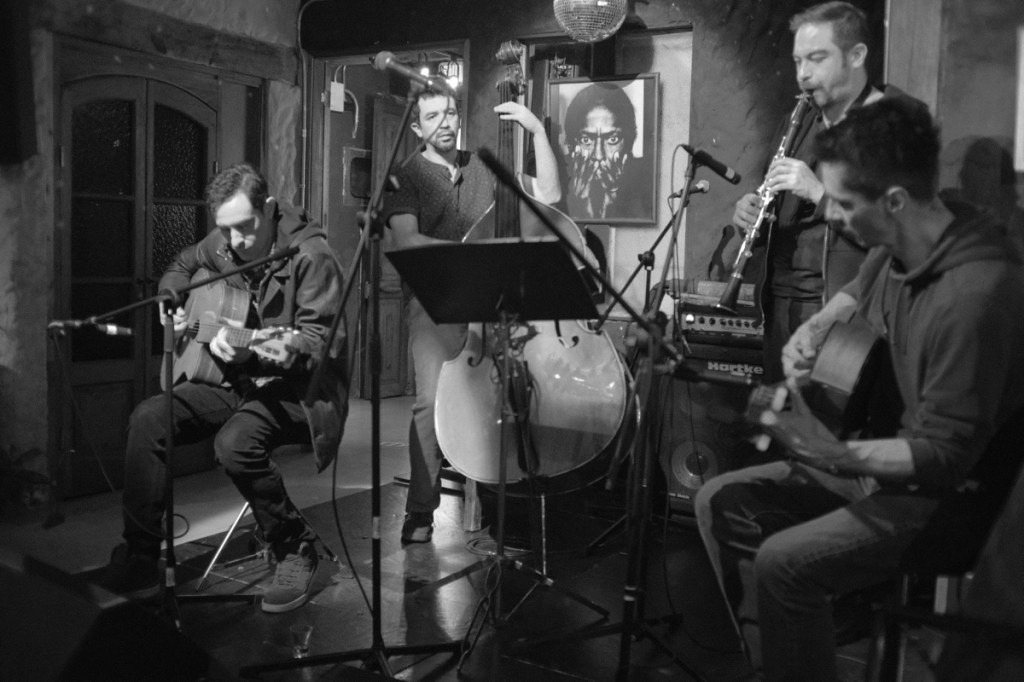 One evening, after Leo and Mary went to bed, I thought Iโd stroll around a bit more in the neighbourhood. Walking next to a bar, I heard a familiar tune, I entered and there, in the heart of Bogota, a local band was playing the music of Django Reinhardt! Thatโs how I met the Hot Club de la Candelaria! I went back to fetch my guitar and we jammed together โค๏ธ