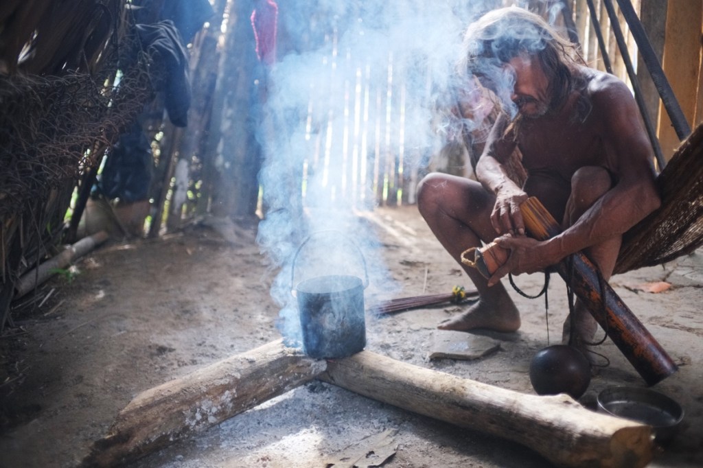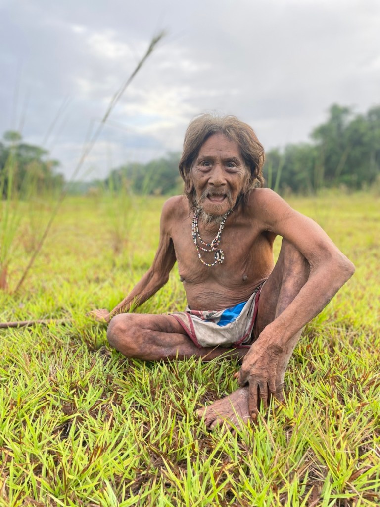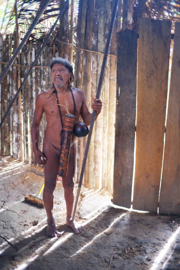 In the afternoon, we go meet Miniwa, a 75(ish) year old man chosen to become the next shaman. He lives with his wife in an isolated hut, further away from the main settlement, and welcomes us in the traditional outfit, which is no outfit at all. After greetings and some group photos, we enter his hut, where he demonstrates how he prepares the poisoned darts used for hunting.