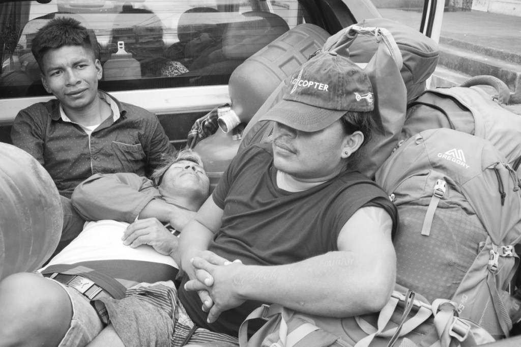 And so we finally met Wareka, our guide with whom I had been exchanging WhatsApp messages. Heโs a short, strong, young man in his early thirties with a friendly smile. He comes with ยซ Mr Paharito ยป (named after his ability to imitate birds) who speaks some english, to help as a translator, and two cousins; Yatey and Raoul. Theyโll be our escorts into the jungle.
