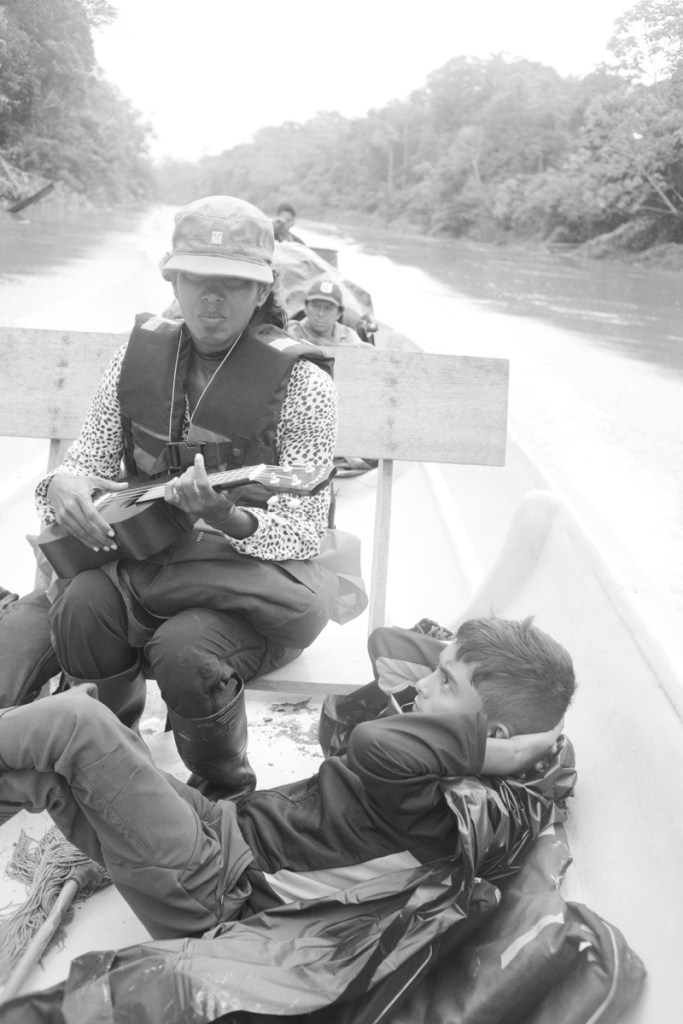 Today is the big day: we go hunting for monkeys. The team is comprised of Wareka, his father Guinto, his uncle Baiwa, his cousin Mauricio, Baiwaโs son who brought Dario, a german tourist, and Miniwa, the shaman to be. Two kids a bit younger than Leo come along. Raoul drives the boat, Paharito, Kipa and his wife have also come for fishing.