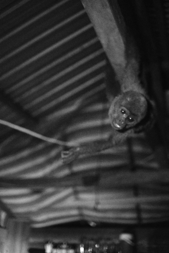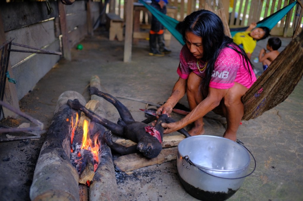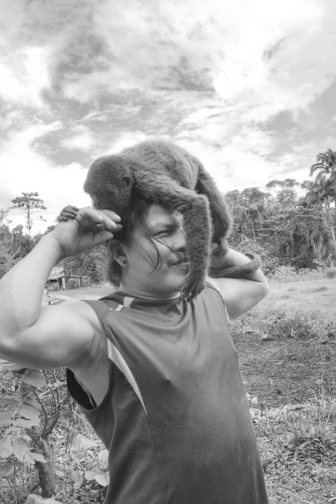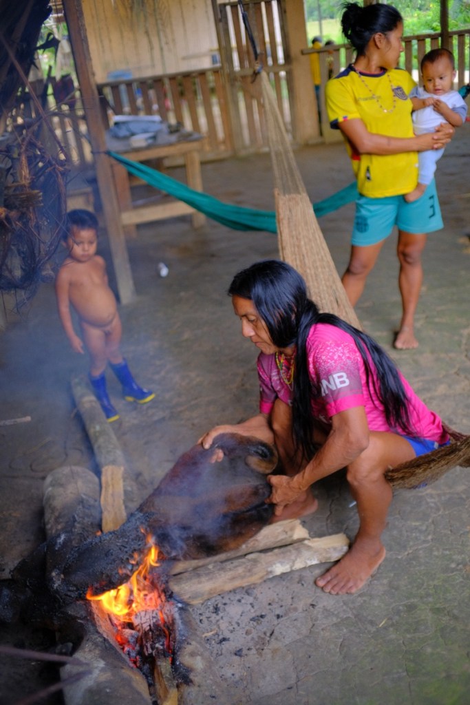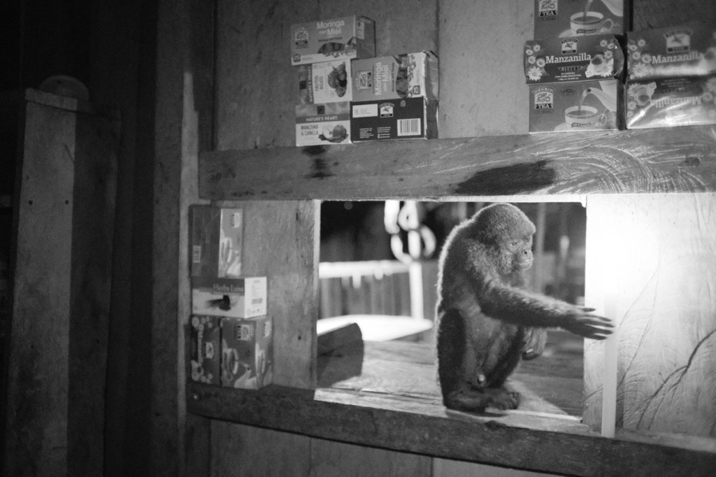 The next morning, a woman was nibling on a monkey hand, asking cheerfully how we liked the meat, while her baby in the hamoc was sucking an arm bone.