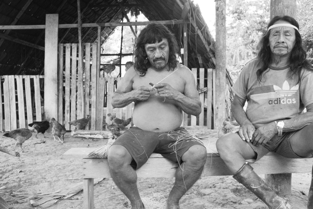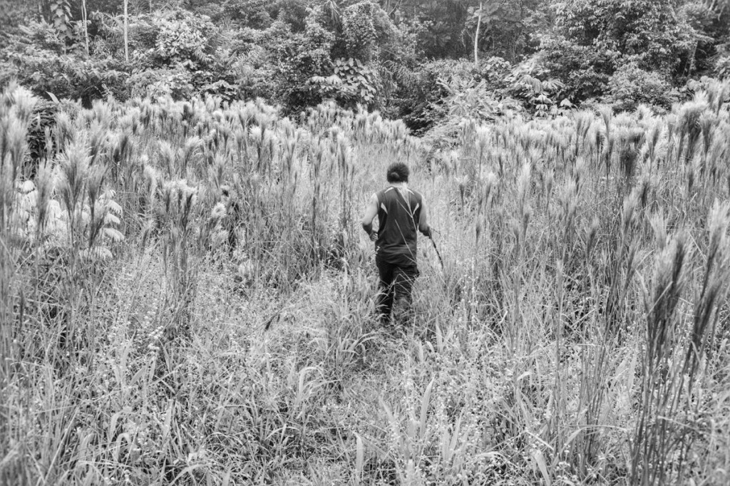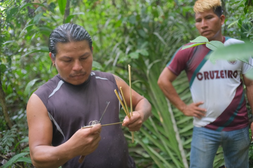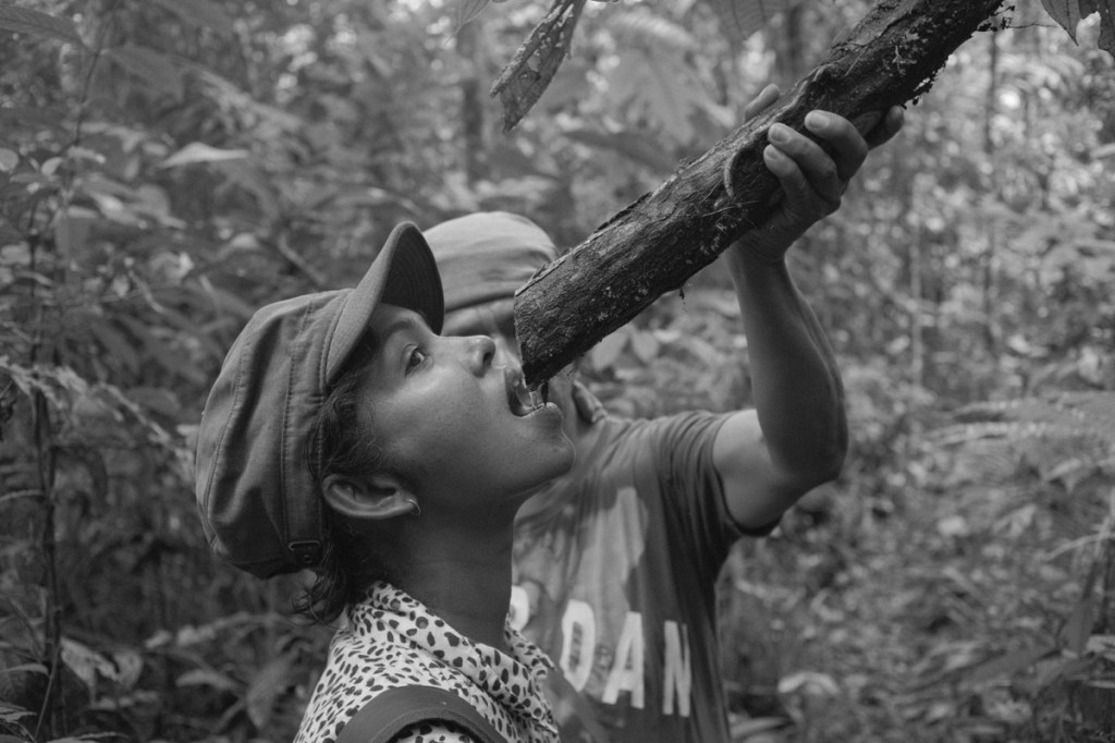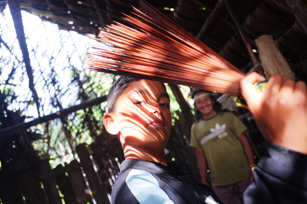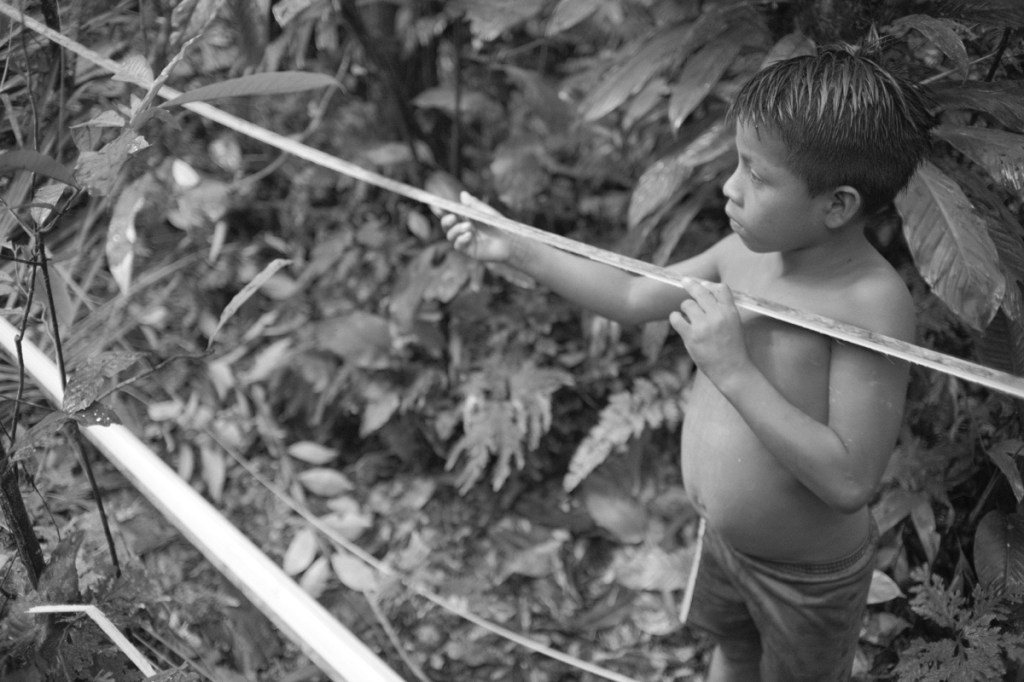 On the second day, after a breakfast of bread, butter, jam, coffee and eggs, Wareka and his father Guinto, took us for a walk in the ยซ backyard ยป, our first walk into the jungle, behind the settlement. They showed us some of the plants they use, out of the incredible biodiversity. Plants to cure fever or diarrhoea, plants to cure bites of venomous snakes, plants to imitate bird sounds, termites nests to make antiseptic, plants to use as soap and toothpaste, plants to drink fresh water from, tree ants that taste of lemon, plants to make razor sharp knives, plants to make strong threads that they use to make hamocsโฆ and plants to make the darts that weโll be using tomorrow and plants to make the poison that they put on the darts.