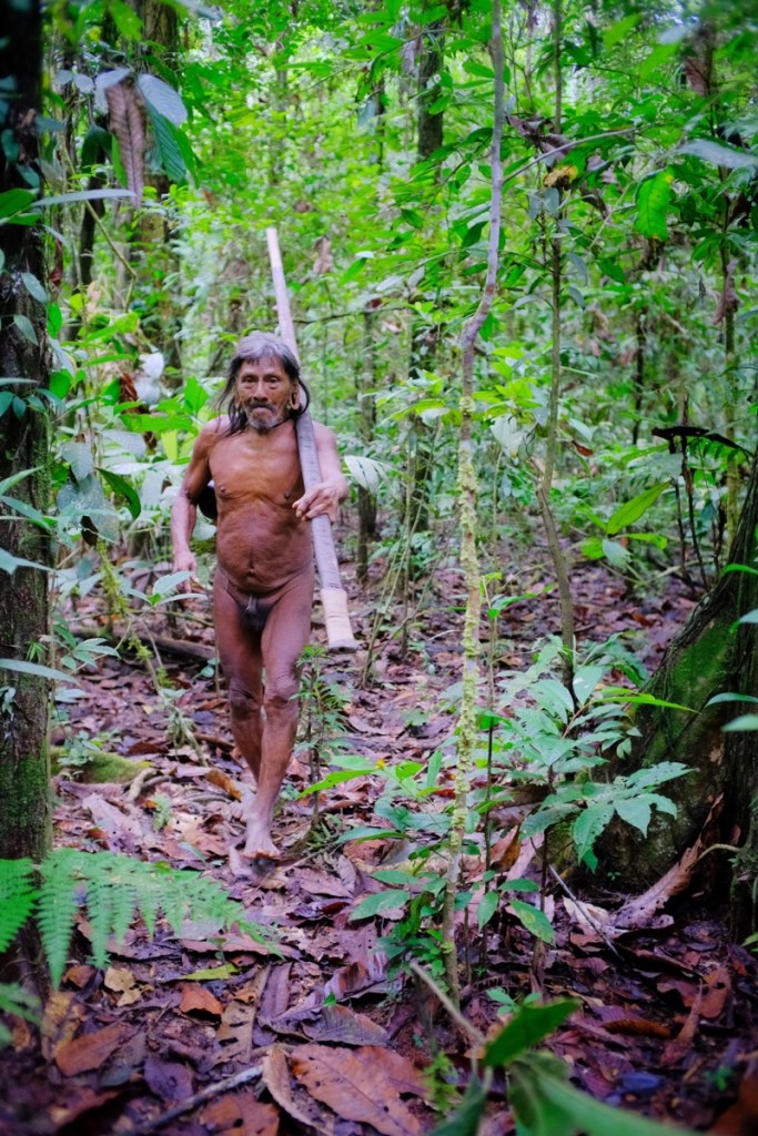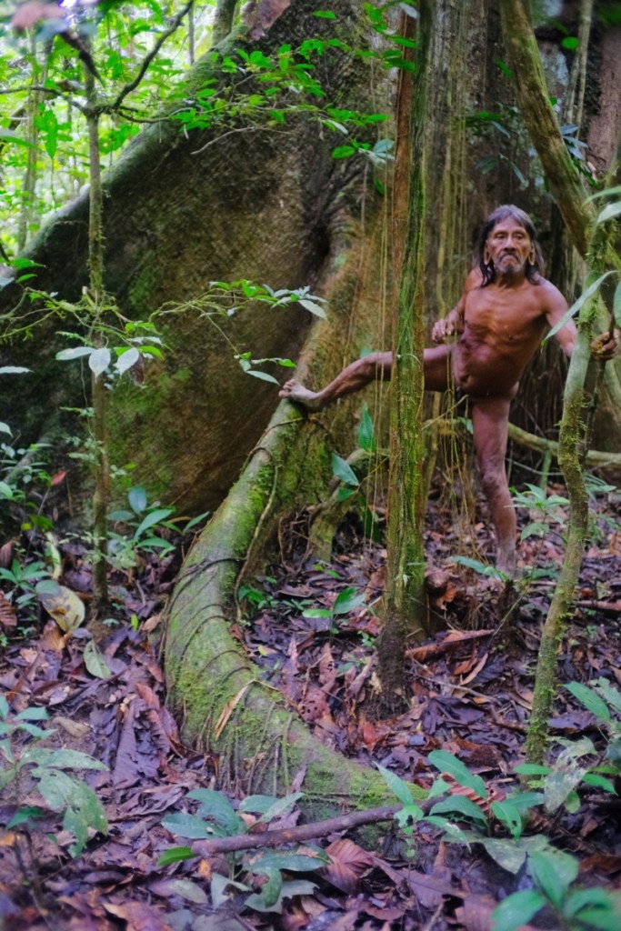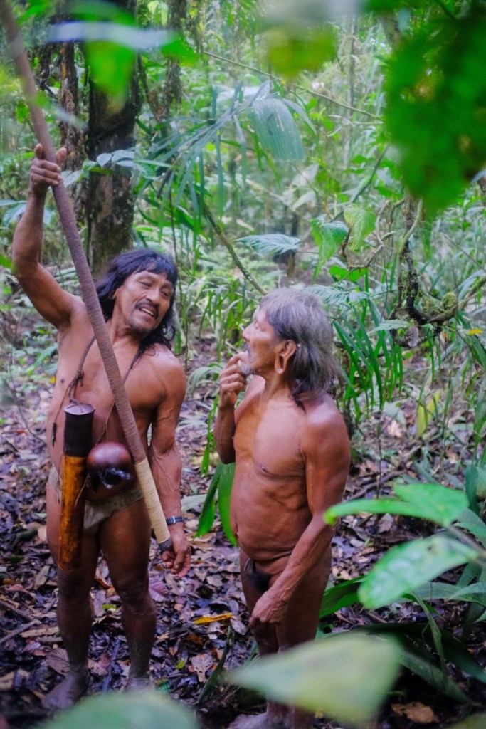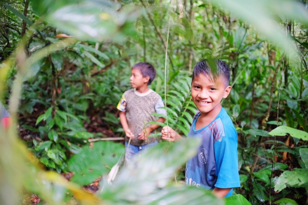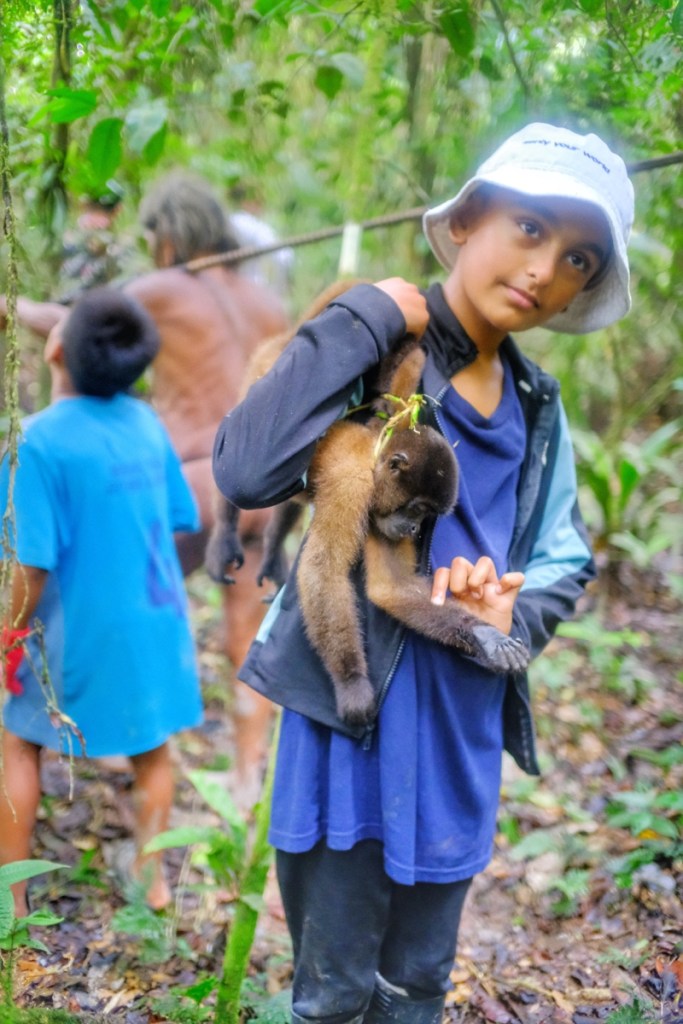 As soon as we debark, Baiwa and Miniwa remove their t-shirt and start running naked in the jungle, at an incredible pace, armed with their long spears and blowpipes! No path here, weโre just dashing through the thick forest and get entangled in vines. Soon we find open fruits on the ground, we hear the sounds and spot our first monkey perched high up on a tree. (They spot. We have the hardest time seeing anything, weโre too busy keeping up with the group and making sure we donโt get lost!)