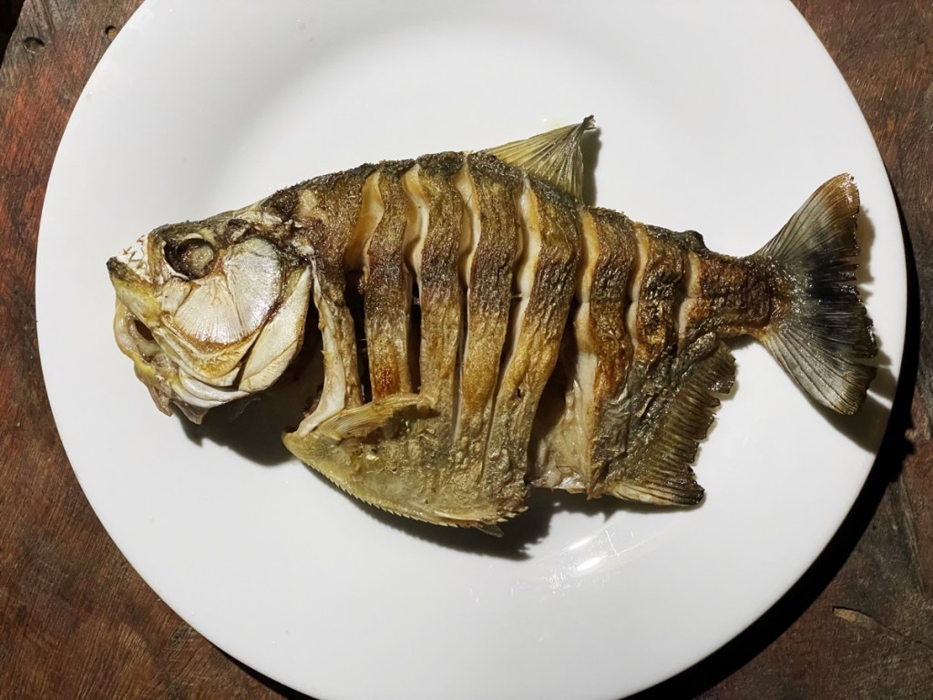 In the evening, after our normal dinner (vegetables, rice and chicken cutlet) we get to try the grilled piranha and a piece of boiled monkey arm. The piranha was delicious but we were a bit more reluctant to try the monkey. At least we had an easy piece of muscle (and not the head!). It had the typical strong flavour of game meat and the smokey smell of the fire. Still, more tender than I expected.
