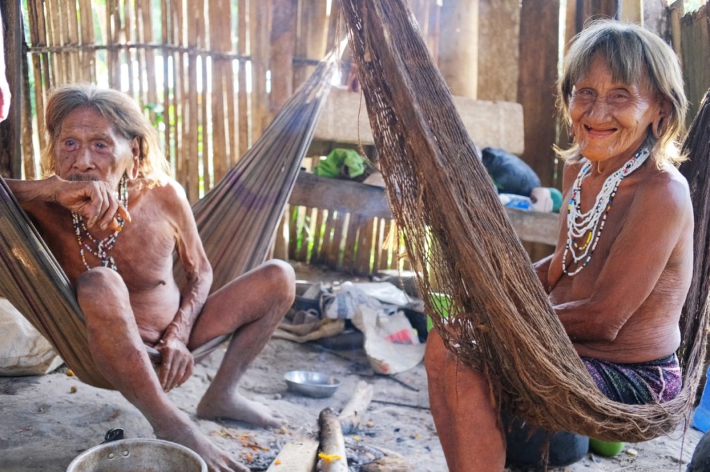 After leaving Miniwa, we get back to the far end of the main settlement to meet with Kempere the present shaman, who lives with his wife Mehiemo. Kempere is said to be 120 years old! It seems vastly exagerated but he certainly looks from another era. Before the woaronis became contact people, Kempere was leading the rebels that chased the oil companies and the army away from these parts of the jungle, with spears and blowpipes! In spite of their old age, they are both radiant with smiles. After Kempereโs death, Miniwa will be the new shaman.
