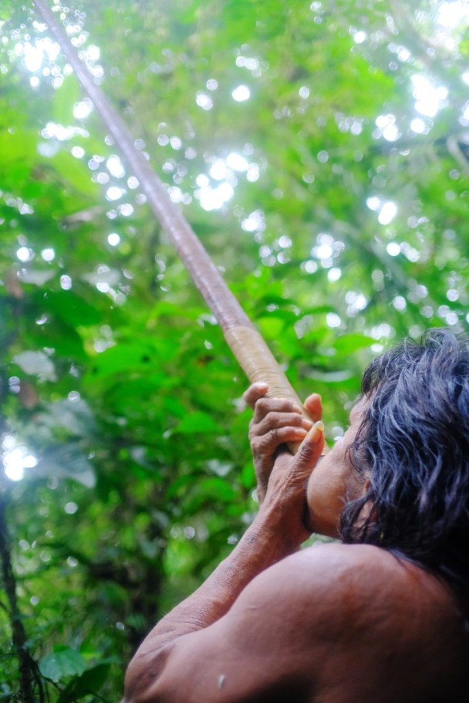 Finding the monkey is one thing, killing it is another story! We make loud noises and shake branches to get the monkey to move and reveal its position, or move to a branch where we have better visibility. The monkey sees us and jumps away to another tree. We run after him, looking upwards for the monkey and downwards for the vines and holes on the ground. And we repeat the process. Every once in a while they see an opportunity, quickly load the blowpipe with a dart and blow it hard towards the canopy. (I canโt even see the damn monkey!)