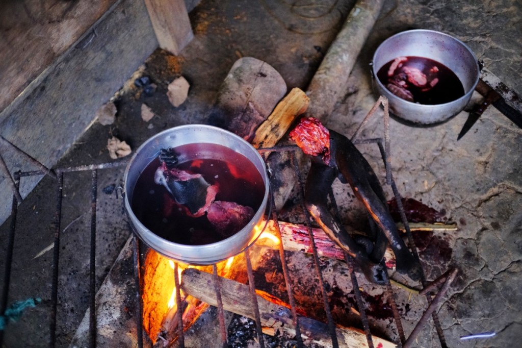 Back at the camp, a woman prepares the monkey for diner. She starts by burning and scraping off the hair. Then she removes the insides and genitals. Finally she cuts off the arms and head and torso and puts everything in a big pot, a first one to wash, and a second one to boil everything in water. Of course the human like shape made the whole scene slightly disturbing!