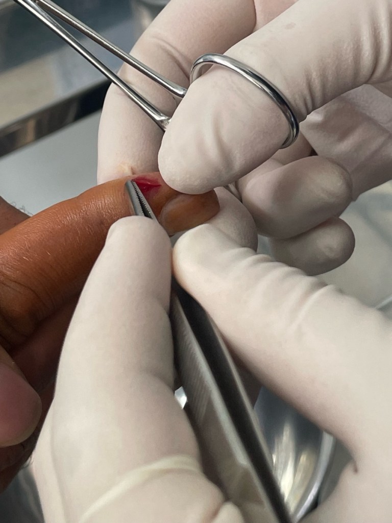 Remember that fall on the spikee branches a few days back? One of the splinters was still buried in my finger and it was getting infected, so I had to take care of this before we moved on.
