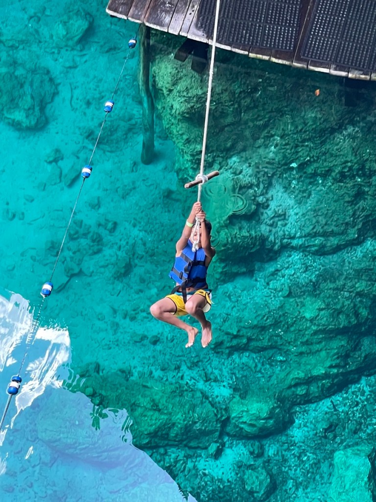 Our funky bungalow Cenote ZemwayThe tightrope walkerThe Tarzan ropeSwimming with turtles 🐢😍Mary is elegantly taking the light before leaving the Cenote