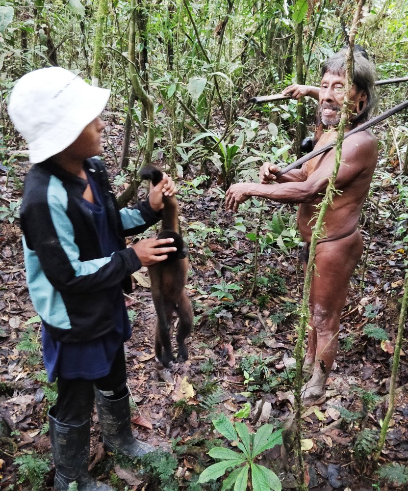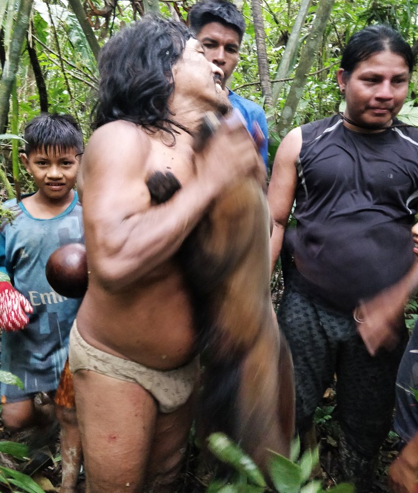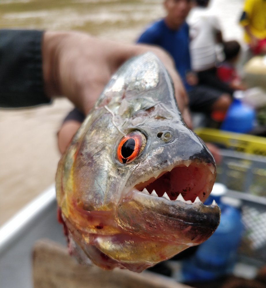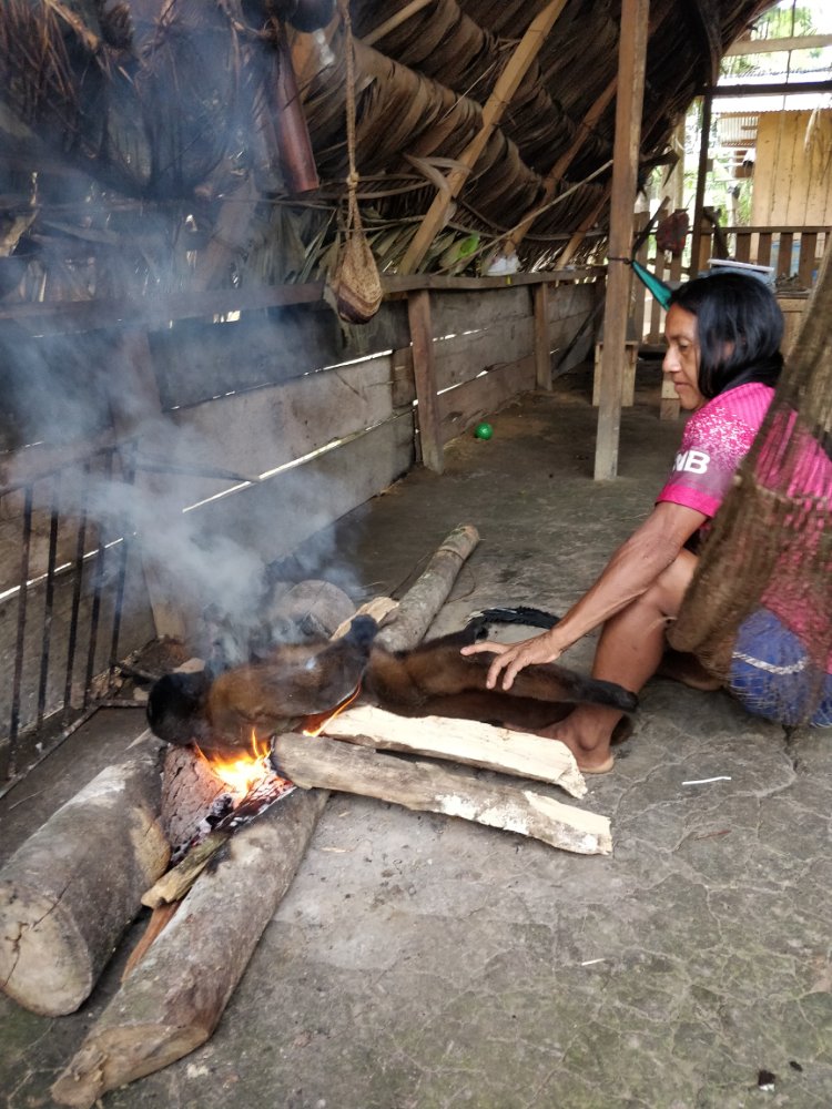 The next day we left to hunt and fish with Wareka, Miniwa, Baewa and Ginto. We were joined by a German tourist called Dario. There were of course some kids who came along. It was a boat ride further down where there is a monkey population. As soon as we were on shore, Miniwa and Baewa took off their clothes and put on the heavy wooden blowgun, the poison darts and cotton container around their necks. The kids were the first to spot the monkeys. What followed was a chase which left us panting and heaving through the swamp, getting entangled in the vines and getting our foot stuck in the marshy soil. At one point Dario couldn’t get out and I remembered a wildlife episode I had seen where you should lay sideways to get out. I suggested he do this and it worked! For once I felt useful in the jungle. Most of the time I couldn’t see the monkey but Wareka and his team knew exactly where they were. They took aim and the first victim was a baby monkey. Apparently they were targeting the mother who abandoned the baby and the baby got hit by the poison dart. They proceeded to tie the monkey in a way that it could be carried like a handbag. It’s hands felt like velvet. Much to his alarm, they gave the monkey to Leo so he could carry it. He reluctantly took the monkey to save face in front of the kids. The second monkey was large and made us run a lot. We were out of breath by the time they got him. He fell from the tree and Baewa quickly strangled him. They then rubbed his body over theirs. It was to ensure that the prey animals do not smell the predator. They stopped hunting as this was enough to feed everyone. The second big handbag was given to Arjun who clearly wasn’t at ease. We then went fishing or rather the boys went fishing. Women are not expected to hunt and fish so I wasn’t given a rod. The woaranis caught a lot of catfish, Pajarito caught a piranha and Arjun caught a sardine. Arjun somehow managed to slip and fall in a bush of thorns and had them embedded in his palm. Arjun is of course a champion in the urban jungle!
